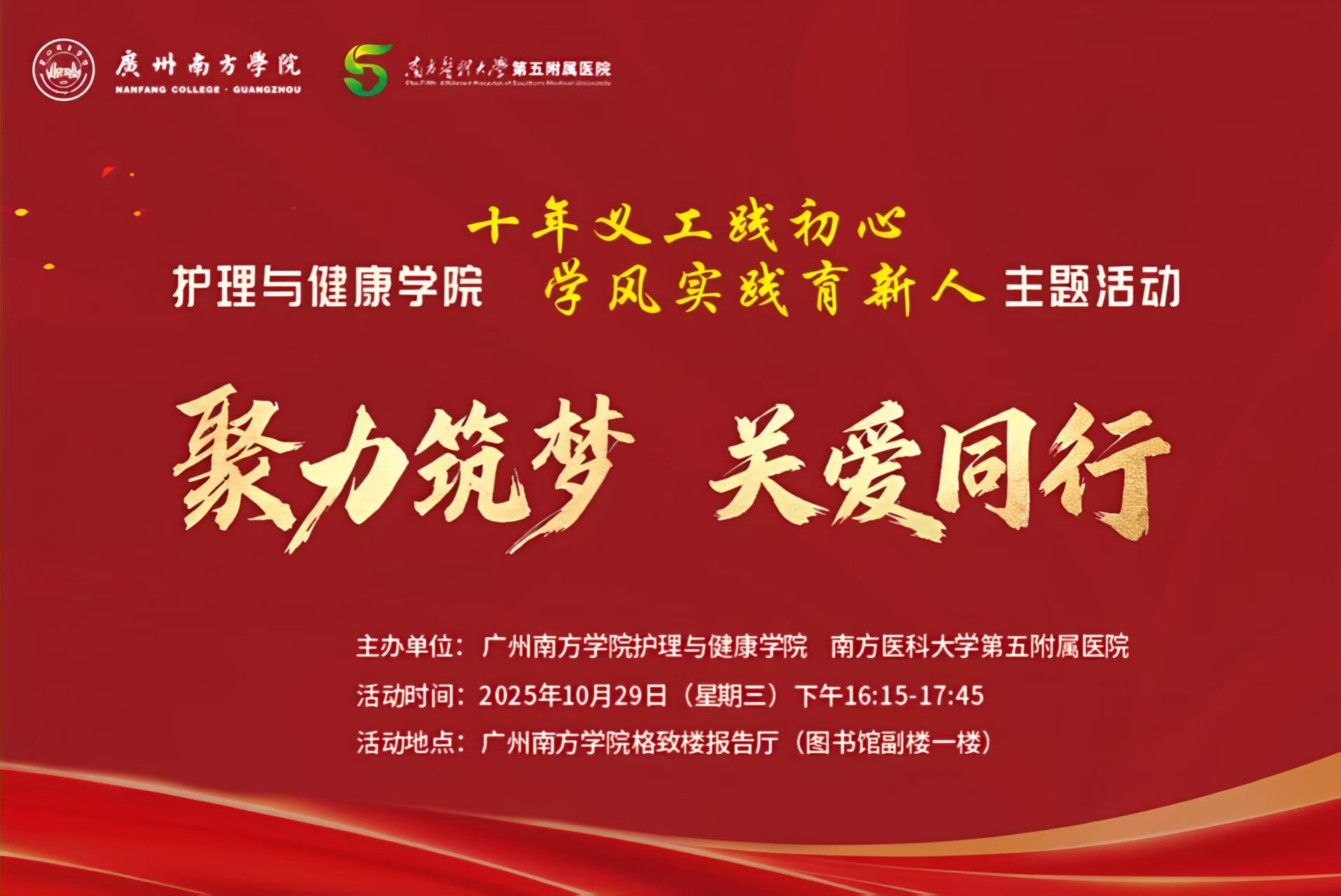 为弘扬志愿服务精神,深化学生职业理解,提升专业素养,广州南方学院护理与健康学院于2025年10月29日下午,在格致楼报告厅举办了以“十年义工践初心 学风实践育新人”为主题的十周年义工总结大会。我院特别邀请南方医科大学第五附属医院党委副书记孙健、护理部朱燕妮主任、护理部钟丽玲科护士长、宣传科负责人宗世琪、团委负责人陈诗婷、中山大学附属第一医院校友张菊、曾彩玲、广州南方学院党委书记李建超、护理与健康学院院长方海云、广州南方学院优秀义工代表赵怡婷、全体教师及各年级学生代表参与本次活动,一起回顾十年义工历程,分享实践成果与感悟,展望未来志愿服务与专业育人相结合的新篇章。