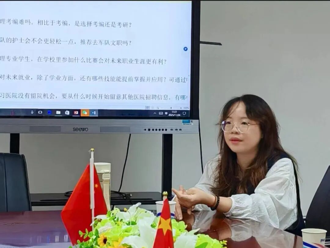 座谈会上,黎学颖老师针对学生实习前的操作恐惧心理,提出放平心态、专注按标准完成操作流程的解决办法,同时告知学生在校期间已通过系统的基础护理练习积累一定的护理实操经验,缓解其焦虑。就实习与论文、护资备考的时间平衡问题,黎学颖老师建议 7-8 月确定论文导师后尽早选题、提前搜集文献搭建框架,实习期间同步结合科室出科考核复习护资知识点。黎学颖老师还提到不同科室实习重点存在差异,如ICU 侧重仪器使用与多学科协作,同时提醒学生可通过考取红十字急救证书、参与专业竞赛、积累义工或三下乡实践经验提升就业竞争力。