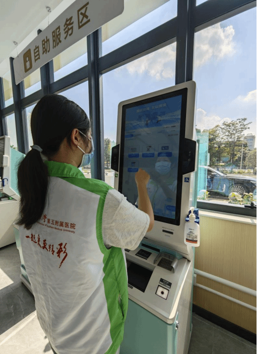 初次到南方医科大学第五附属医院,我和朋友一起被安排到一楼的自助挂号机处帮助患者操作机器。因为是周末,人流量比较大,我们刚到岗位,便有患者前来询问。虽然我们经过了护士老师的培训,但面对实际操作时,仍然显得有些生疏,只能按照生活经验摸索着引导患者。