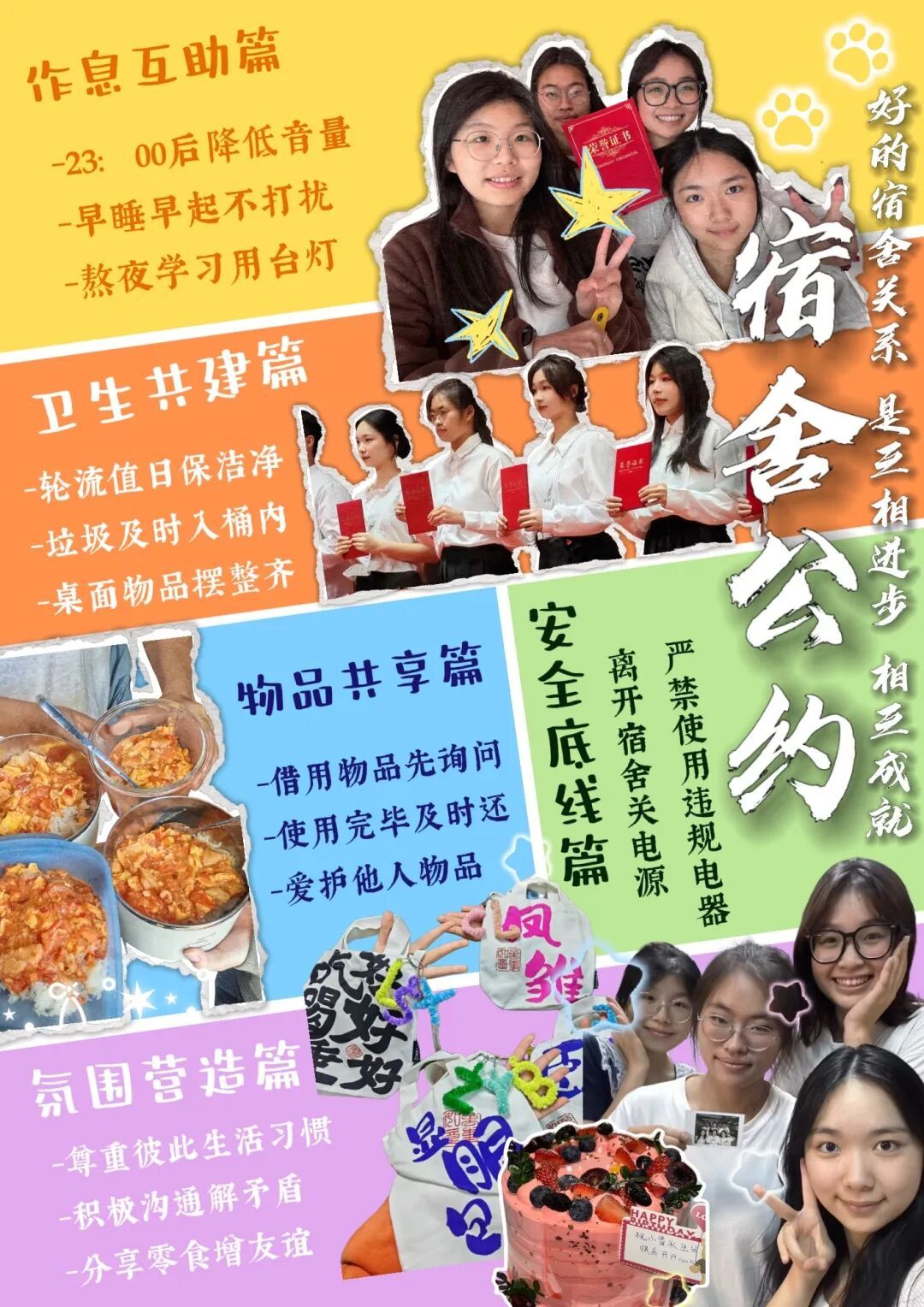 在评选过程中,各参评宿舍踊跃投入,展现出良好的精神风貌与集体凝聚力。整洁有序的居住环境、细致规范的宿舍公约、互助友爱的相处氛围,均体现了我院学子团结向上、严于律己的优良风采。经过激烈的角逐,宿舍公约评选结果如下: