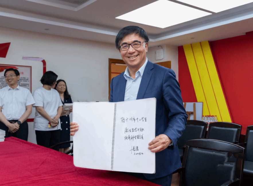 讲座开始前汤涛校长为广州市中小学生题词“激发数学兴趣,培养科学思维”