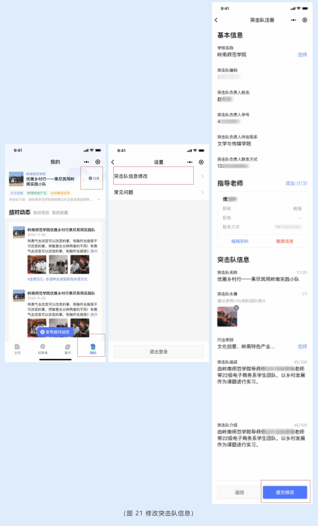 如需修改突击队名称、简介等信息,可在我的页点击【设置】,选择【突击队信息修改】,修改相关信息后点击【提交修改】即可完成突击队信息修改。