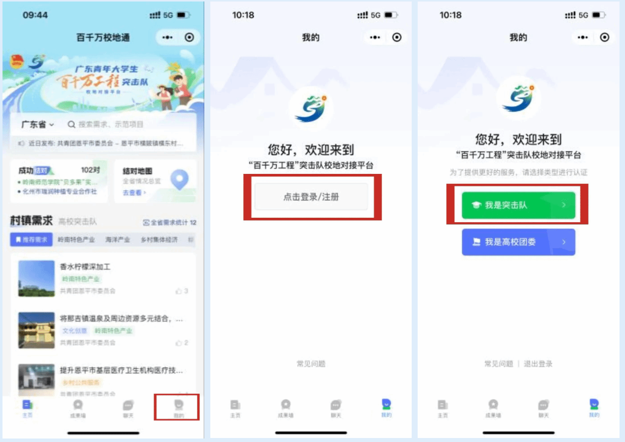 进入“百千万校地通”平台小程序后,点击底部导航栏中的【我的】进入“我的”页,选择【点击登录/注册】,在用户协议弹窗中选择【同意并继续】,在手机号获取弹窗中选择与微信绑定的手机号,在注册页面点击【我是突击队】,即可进入突击队注册页面。