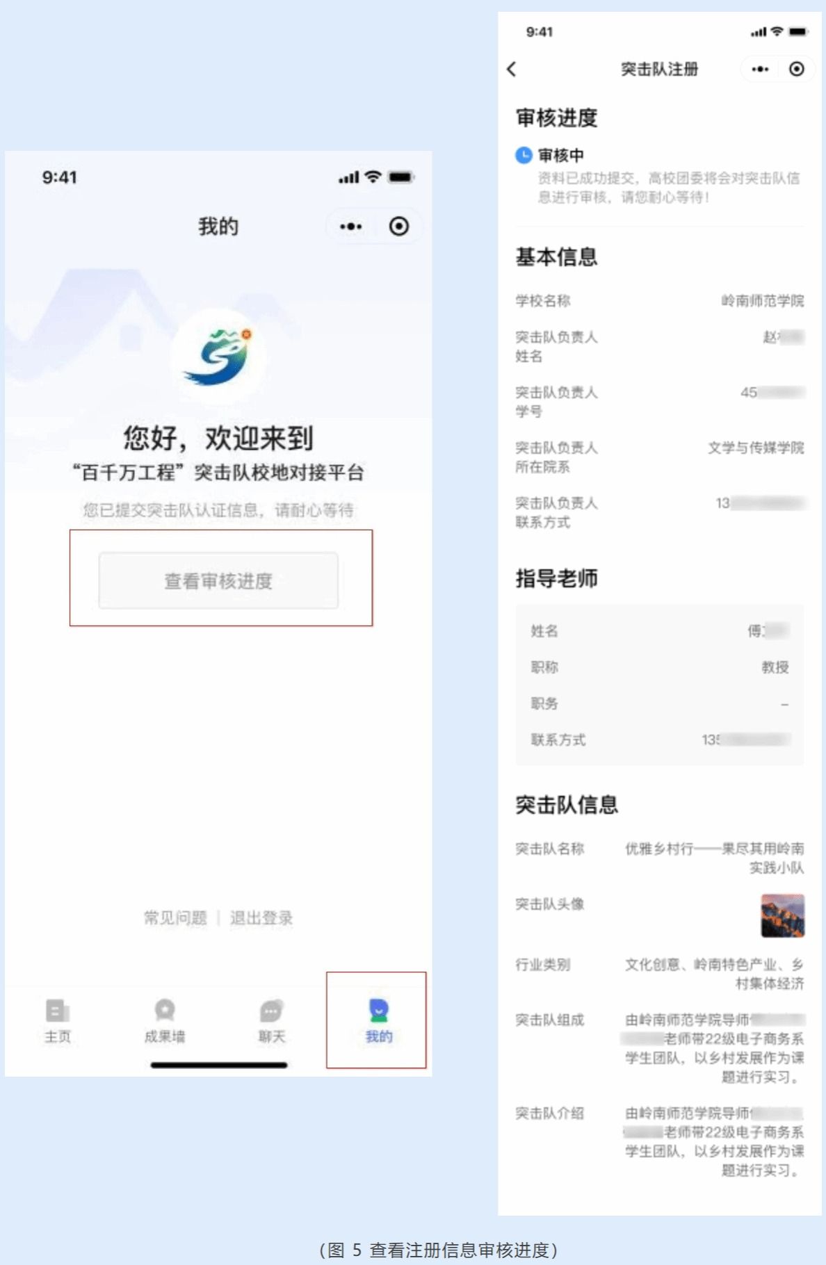 提交后,突击队的注册信息将自动发送至对应学校团委进行审批,突击队可通过“百千万校地通”平台小程序端“我的”页查看审核进度。