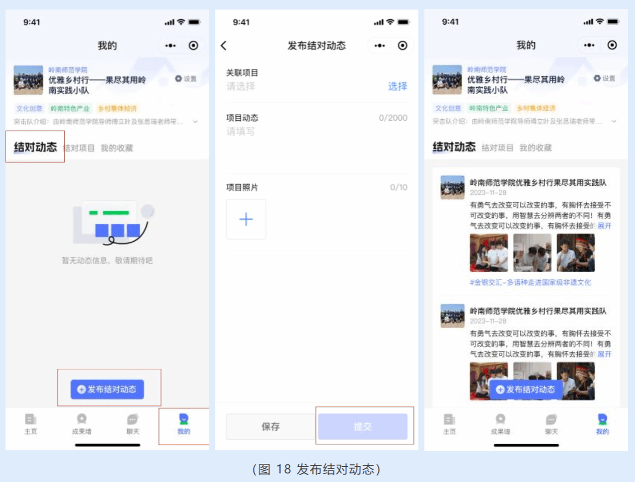点击底部导航栏中的【我的】进入“我的”页,“我的”页集中展示了突击队名称、介绍、结对动态、结对项目等信息。选择【结对动态】后,点击下方的【发布结对动态】,按页面提示填写结对动态,点击【提交】即可发布动态。