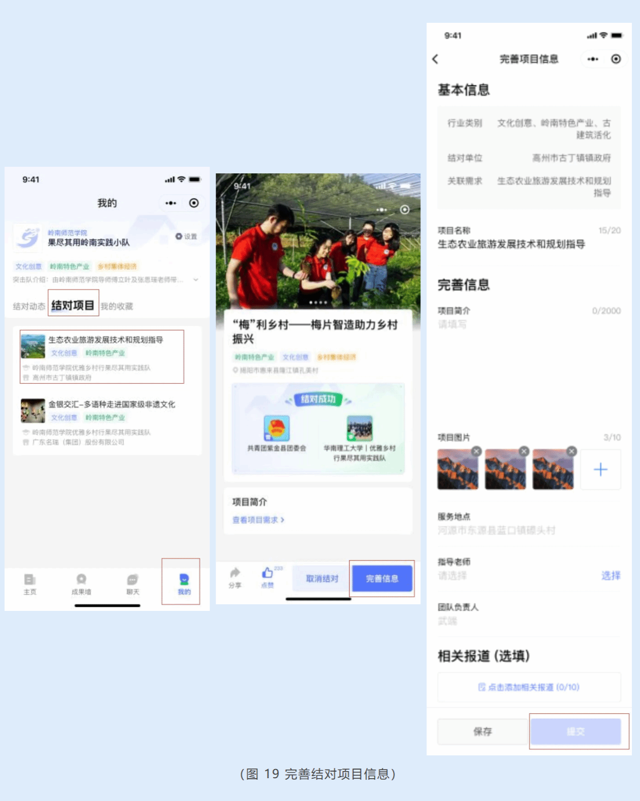 在“我的”页点击【结对项目】,可查看已实现结对的项目清单。点击对应项目可进入项目详情页,查看项目名称、需求提出单位、项目所在地等信息。点击【完善信息】将进入项目信息编辑页,可在已有项目信息基础上,补充完善项目简介、指导老师、相关报道等信息。完成填写后点击【提交】即可更新结对项目信息。
