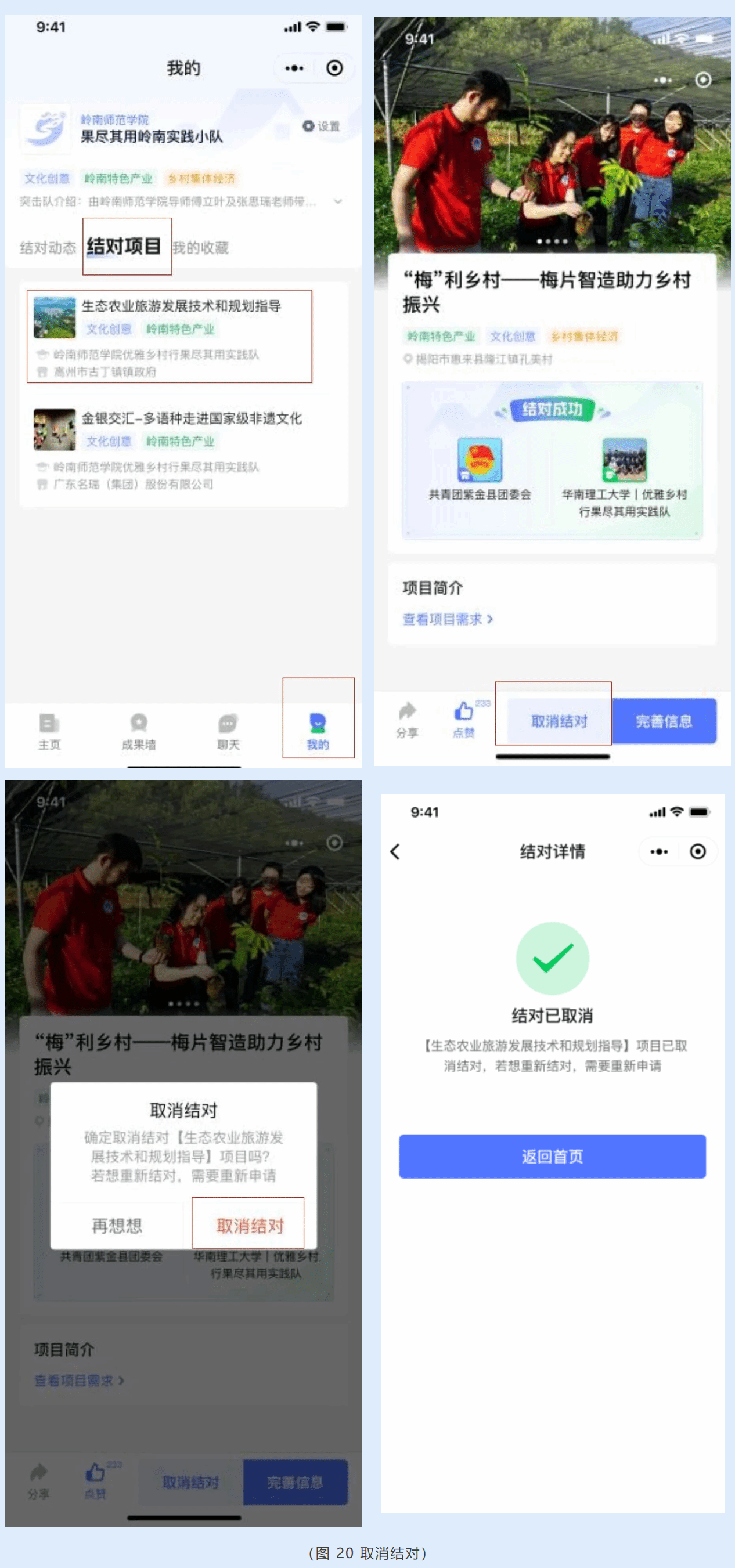 平台还提供【取消结对】功能,学校突击队如遇特殊情况不能完成结对项目,可在结对项目详情页点击【取消结对】,在信息确认弹窗中继续选择【取消结对】,即可完成取消操作。