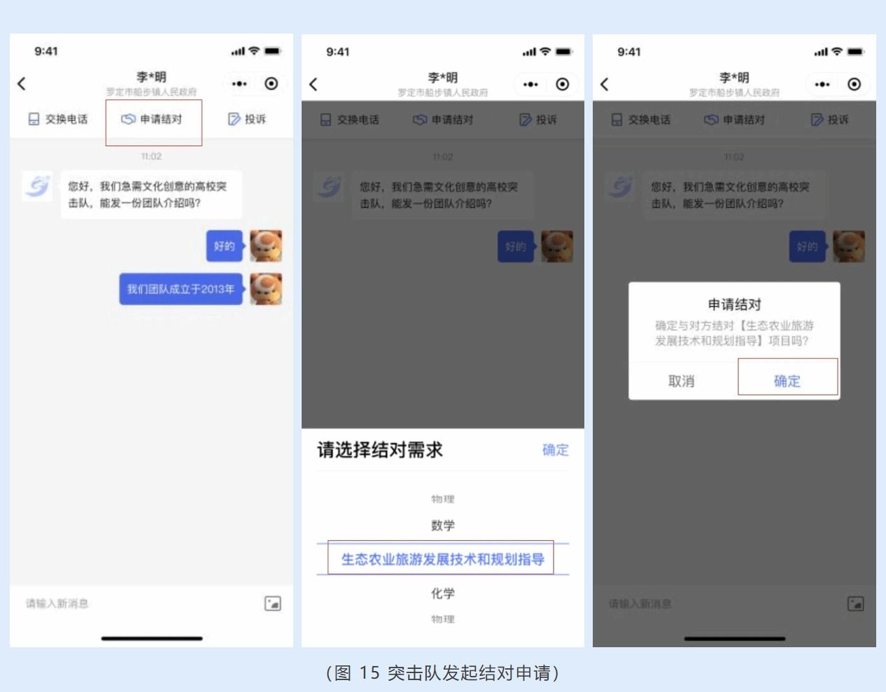 学校突击队了解需求详情后,如有意愿结对,可点击聊天界面上方的【申请结对】,选择想结对的需求,在申请结对弹窗中点击【确定】,即可发起结对申请,待需求提出单位通过结对申请后,即可完成结对。