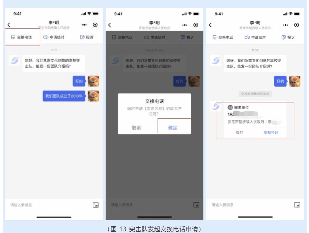 学校突击队如需进一步了解项目情况,可在聊天界面发起交换电话申请,点击聊天界面上方的【交换电话】,选择想了解的需求,在交换电话弹窗中点击【确定】,即可向需求提出单位发送交换电话申请,待需求提出单位同意后,可获取需求提出单位联系人电话,还支持【拨打】和【复制号码】。
