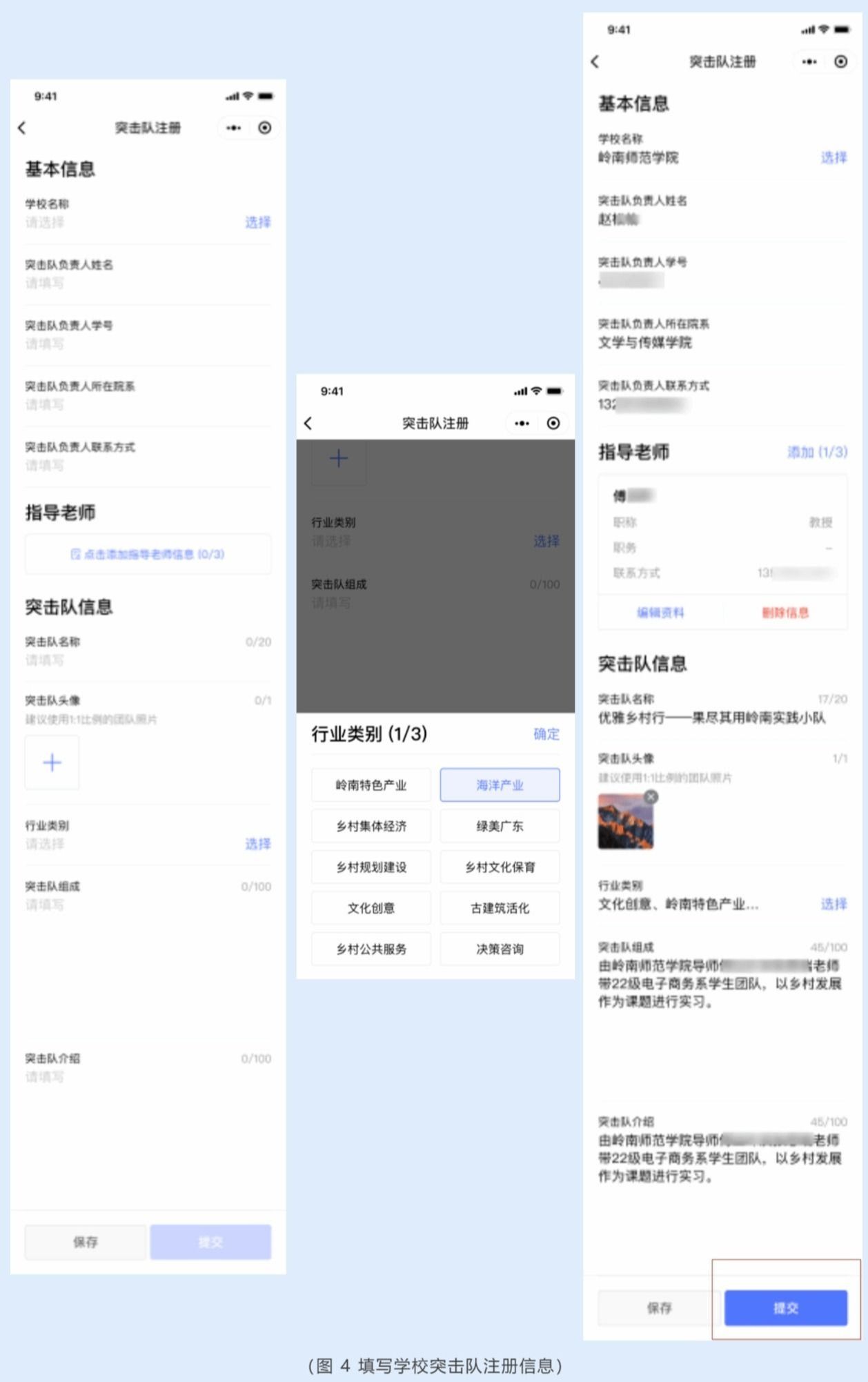 根据页面提示进行突击队注册,选择学校,填写突击队负责人姓名、学号、联系方式、突击队名称、突击队介绍等信息,各突击队可依据团队技能选择擅长的行业类别。填写完成后点击【提交】。