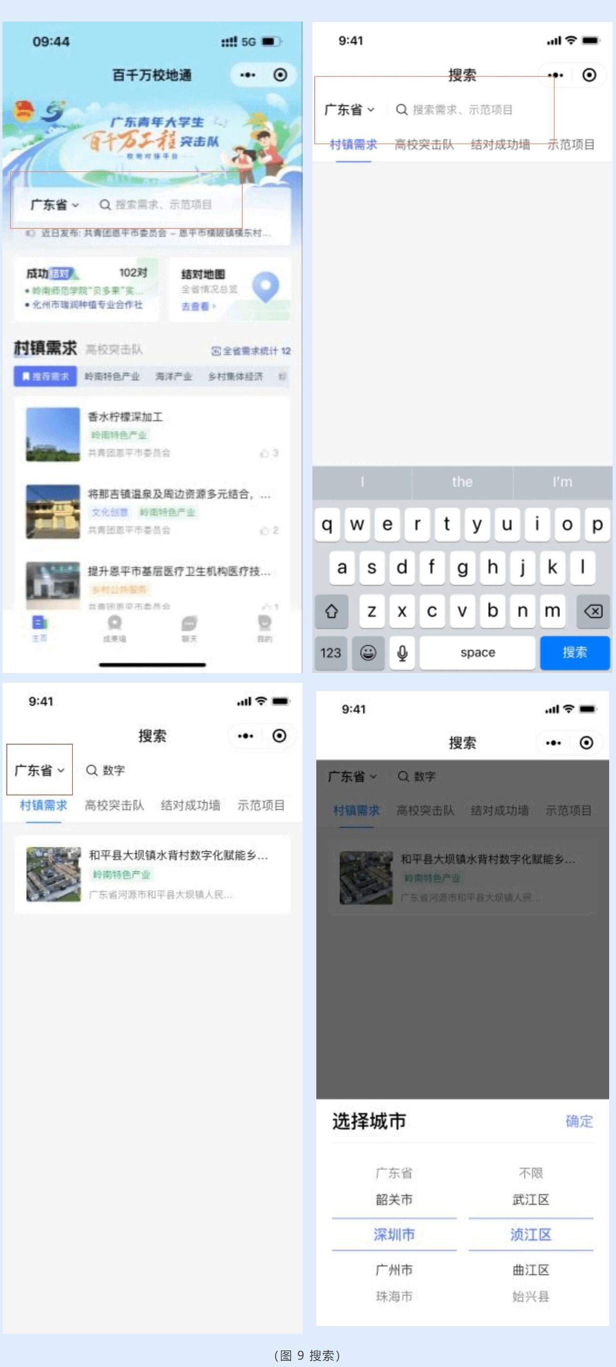 如需查找相关村镇需求或高校突击队信息,可点击位于小程序主页顶部的搜索框,进行快捷检索。在搜索框内输入搜索词即可查找相关内容。平台提供搜索结果筛选功能,将搜索结果分为【村镇需求】、【学校突击队】、【结对成功墙】、【示范项目】四个大类,点击即可查看相关分类下的信息。此外,平台还支持根据地区筛选搜索结果。