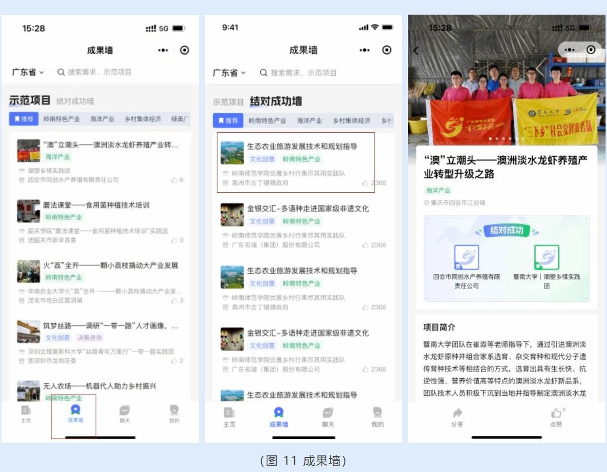 “成果墙”展示了百千万工程的示范项目及结对成功项目,点击“百千万校地通”小程序底部导航栏的【成果墙】即可进入“成果墙”页面,浏览相关项目信息。点击对应项目名称,可进入项目详情页。