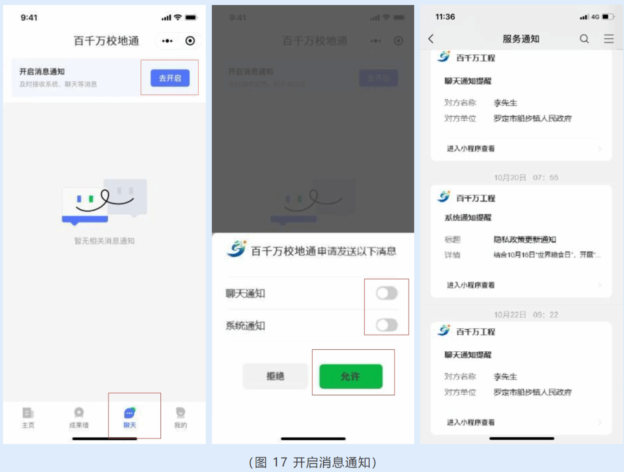 点击底部导航栏中的【聊天】可进入聊天列表页,查看所有聊天记录。为便于学校突击队及时接收聊天消息,建议开启消息通知。点击页面上方的【去开启】,勾选【聊天通知】及【系统通知】,点击【允许】,即可开启消息通知。