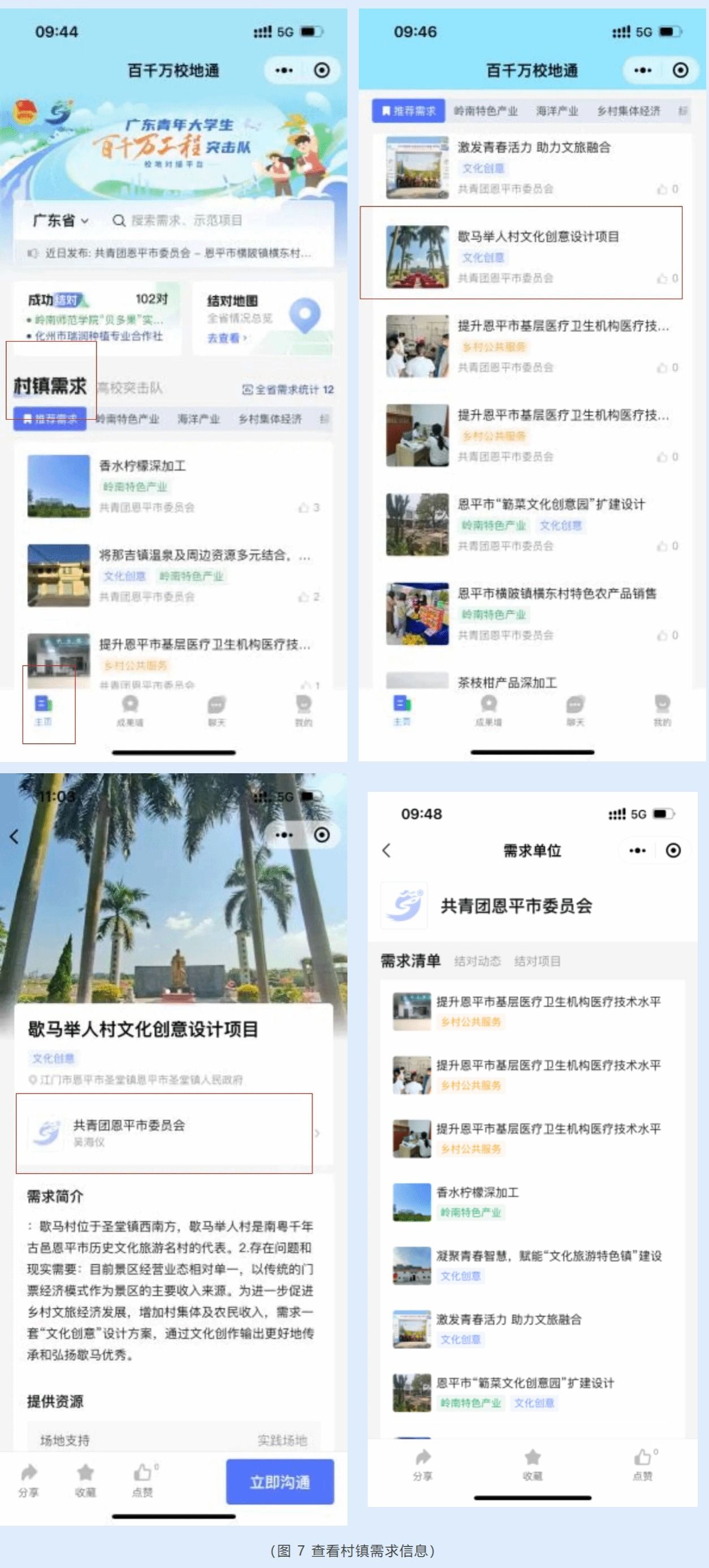 平台提供即时聊天功能,学校突击队可与需求提出单位、其他突击队在线沟通。以学校突击队与需求提出单位沟通为例,学校突击队在浏览村镇需求时,如对某一需求感兴趣,可在需求详情页点击【立即沟通】发起聊天,向需求提出单位了解该需求的具体情况。