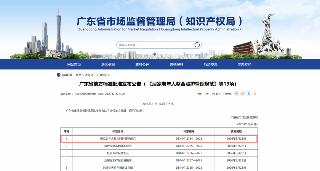 近日,由广州南方学院方海云、黄惠亭团队牵头,联合多家单位共同编制的广东省地方标准《居家老年人整合照护管理规范》(DB44/T 2784-2025)获广东省市场监督管理局批准发布,将于2026年3月23日起在全省实施。该标准为居家老年人照护服务提供了科学、统一的管理指引,也为国家《老年护理服务能力提升行动方案》的落地提供了可操作的“广东路径”,同时标志着高校在引领标准化建设上取得重要突破。