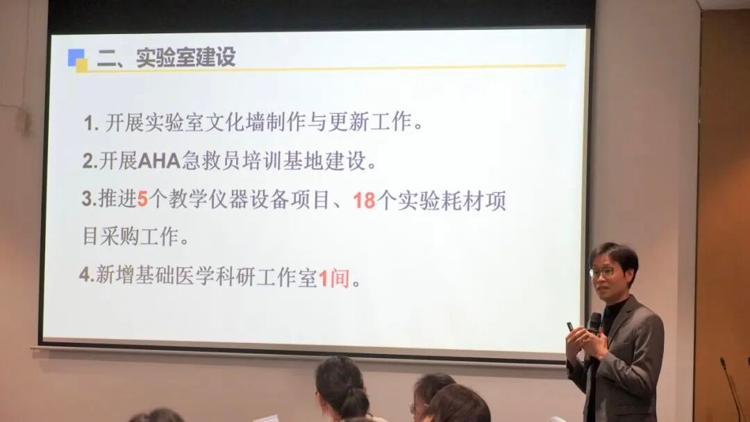 基础医学教研室主任韩婷就课程建设与改革、教科研项目立项及执行、教师获奖情况等工作成果进行了汇报,并阐述了新学期的工作规划。她鼓励教师深耕教学一线,积极参与教学竞赛,主动指导学生赛事,同时坚持以评促建,对标提升,全面推动教学质量与人才培养水平再上新台阶。