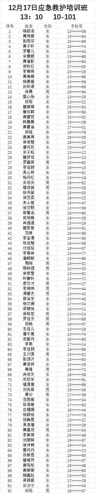 衷心感谢您对护理与健康学院急救培训项目的支持,因活动场地有限,遵循教师优先,先报先得,额满即止的原则,以下师生成功报名护理与健康学院12月17日应急救护培训,请在指定时间前往对应场地,签到时需核验身份: