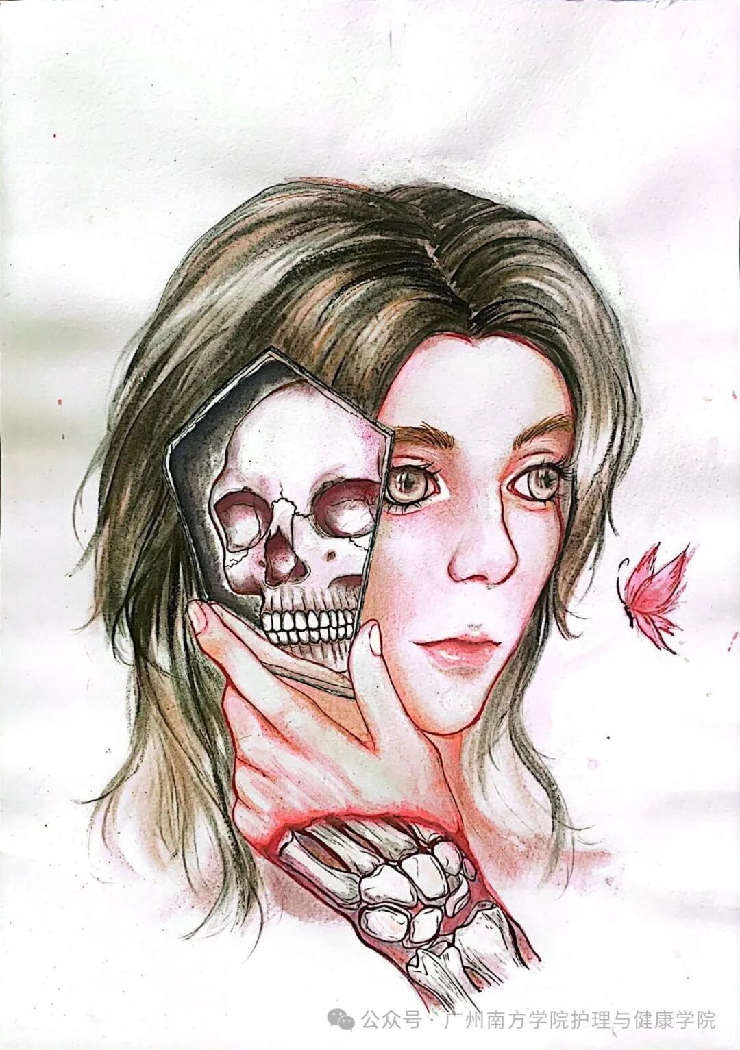 作品介绍:本作品借镜子中骷髅与露骨的手,传达“不过红颜枯骨”的思想。它提醒人们,外在的美丽与鲜活肉体不过是短暂表象,如同绚烂烟火稍纵即逝。繁华皮囊下,生命本质是脆弱易逝的,恰如红颜终将化为枯骨。追求美好的外貌无可厚非,但需把握有度,不要盲目追求外貌而损伤身体健康。人们也更应珍视内在精神,提高内在修养,懂得生命有限与永恒的意义,在绚烂与凋零间探寻存在的真谛。