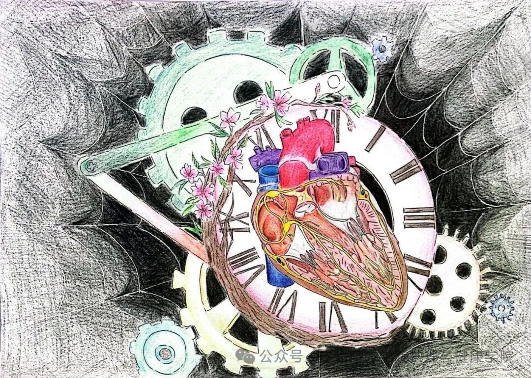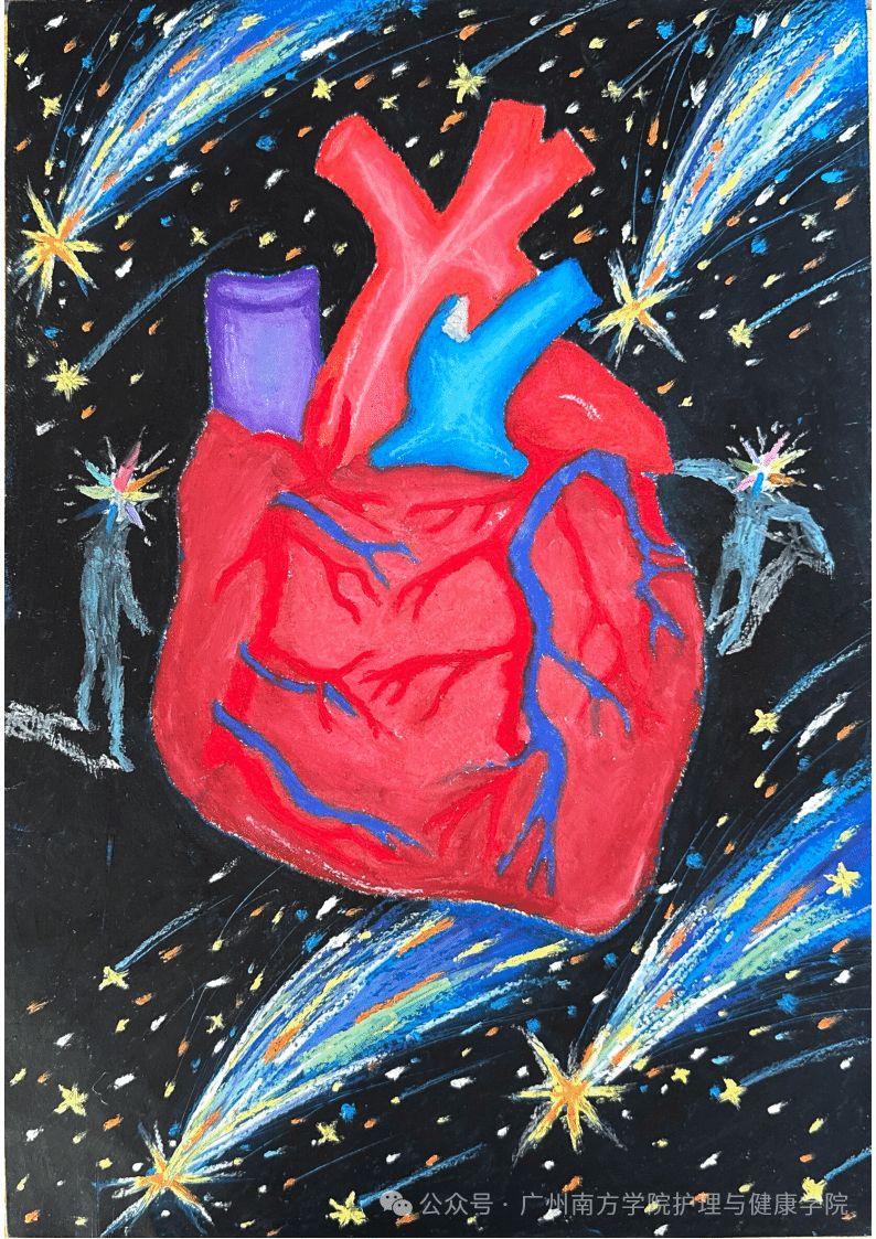 作品介绍:画面中心,心脏宛如一颗璀璨星球,象征它是人体运转的核心。背景里,飞逝的流星代表着人体持续不断的代谢过程,如同宇宙中穿梭的星辰,一刻不停。两侧的小人则寓意着对心脏的守护,他们静静伫立,仿佛在时刻捍卫心脏的健康。同时,背景星光借鉴《哈尔的移动城堡》风格,为画面增添梦幻色彩,既凸显心脏的神秘,也表达出对这一关键的器官的珍视与呵护。