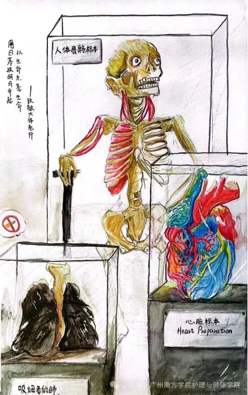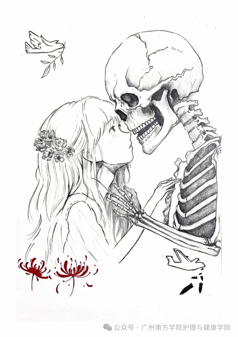 作品介绍:作品整体采用黑白色调,营造出一种庄重、肃穆的氛围,心脏和书本赋予鲜艳的色彩用以抓住视线,心脏的色彩象征着“大体老师”们虽已离世,但他们的生命力在医学知识的传承中得以延续,为医学事业注入了源源不断的活力。而蓝色的书本则代表着承载无言良师奉献所积累的的宝库,大体老师手捧的护士则寓意着他们用自己的身体为医学教育搭建了坚实的桥梁。