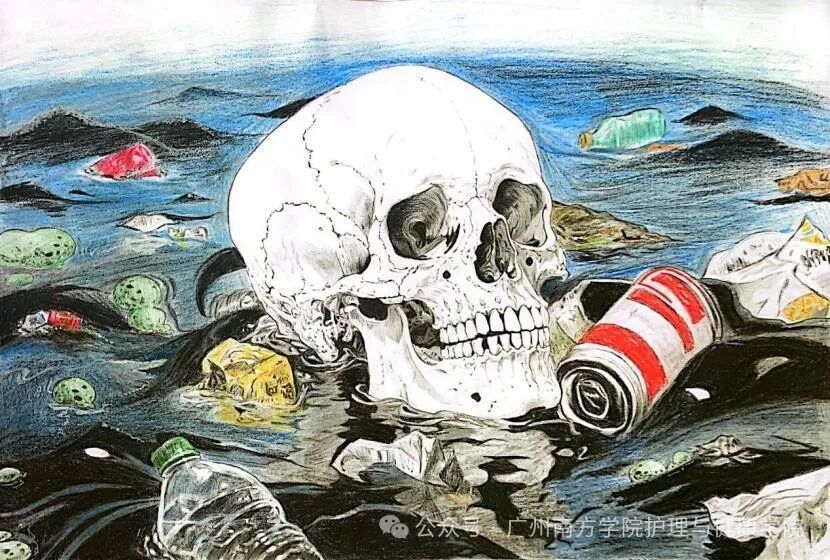 作品介绍:这幅作品聚焦海洋污染。画面核心是海洋中漂浮的骷髅,它象征着无数因海洋污染而消逝的生命,这些生命无法发声。周围散布着塑料瓶、易拉罐、废纸等垃圾,与海水相融,展现污染的严重现象。以解剖视角,呈现污染对海洋生态的致命打击,呼吁大家重视海洋环境保护,守护海洋生态。