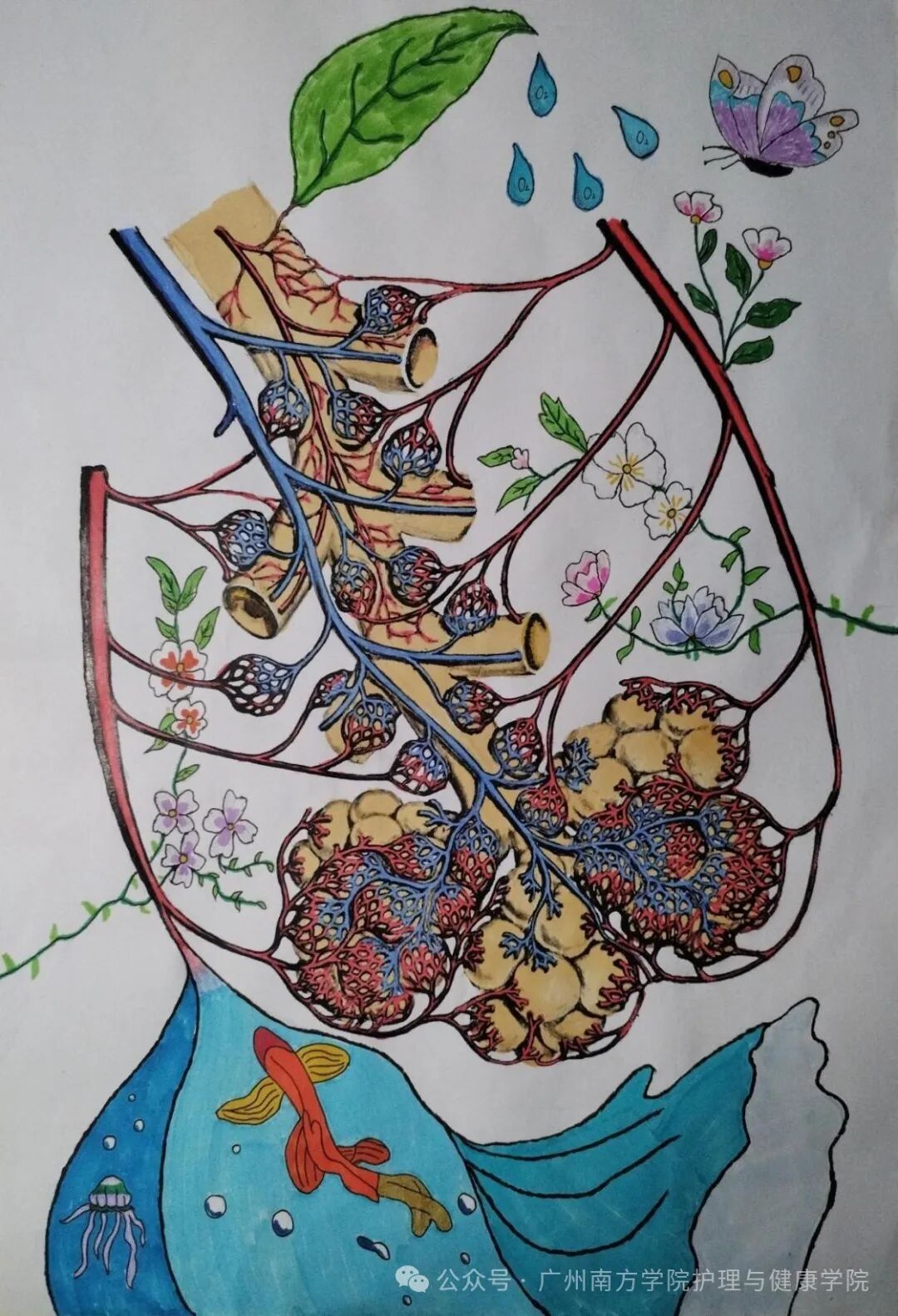作品介绍:这幅作品将人体肺部结构与自然元素(如花朵、树叶、蝴蝶、海洋生物等)巧妙融合,展现了生命与自然的和谐共生。经过对核心意境的构思与创造,该作品既突出了人体肺泡与外部自然的交融,又通过“共舞”一词传递出两者相互依存、和谐互动的美好意象,契合画面所表达的生命整体性与自然共生之美。