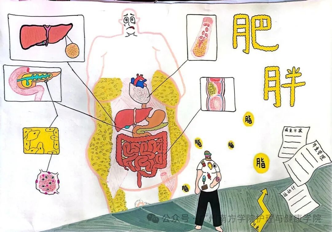 作品介绍:2025年是国家减重年,肥胖引起的诸多疾病都在处处提醒着我们:减脂刻不容缓。该画作描绘了当体内脂肪堆积时,身体内器官所会引起的变化,如:脂肪肝、胰腺受损、冠状动脉粥样硬化等,旨在让大家能够更直观地感受到脂肪对我们身体的影响,传递出对健康生活的呼吁。