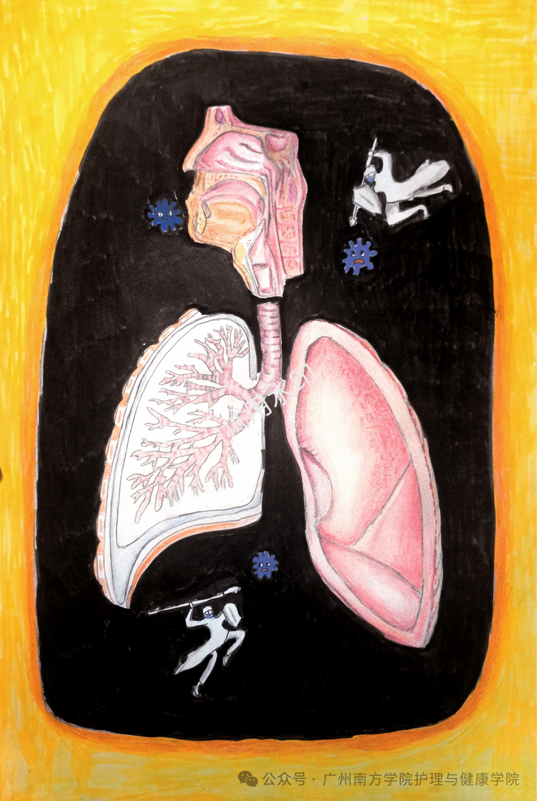作品介绍:这幅作品以人体解剖为主题,聚焦于肺部与呼吸道的结构。画面中央,精细描绘的肺部与气管呈现出复杂的解剖细节,粉红色的肺叶与白色的支气管清晰可见,周围分布着蓝色的病毒状图案,象征着呼吸道面临的威胁。在肺部周围,有手持武器的白色小人,它们仿佛是免疫系统的战士,正在守护着呼吸系统。整个画面以黑色为背景,凸显出人体内部器官的神秘与重要,而黄色的边框则为作品增添了一抹亮色,象征着生命的活力与希望。这幅作品旨在展现人体呼吸系统的精妙构造,以及人体自身抵御疾病侵袭的奇妙机制,呼吁人们关注呼吸健康,珍惜生命的每一次呼吸。