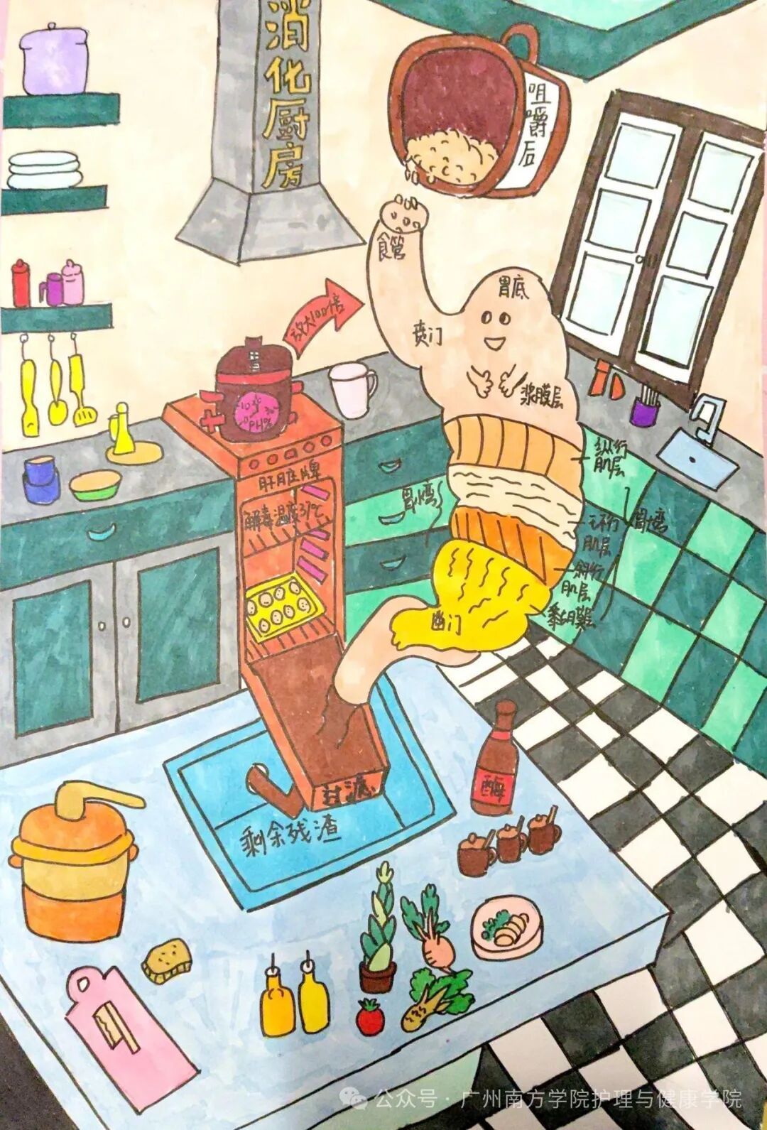 作品介绍:此作品以独特的艺术视角,构建了一个将人体胃部消化过程类比为厨房烹饪的微观世界。画面里,胃幻化为精密运作的“消化厨房”,贲门、胃底等解剖结构巧妙化作厨房分区。咀嚼后的食物经食管入场,恰似新鲜食材被送入后厨。胃凭借蠕动与胃酸分泌等生理活动,如同运用炉灶火候与烹饪技法,对食物进行精细 “加工”。食物在这个 “厨房”中经历物理与化学变化,逐步被分解。而最终的剩余残渣进入肠道,如同厨房清理残余物料。作品通过生动的画面语言,融合医学知识与艺术想象,不仅揭示人体消化奥秘,更展现生命微观进程中精妙的 “膳食艺术”,是科学与艺术跨领域交融的生动诠释。