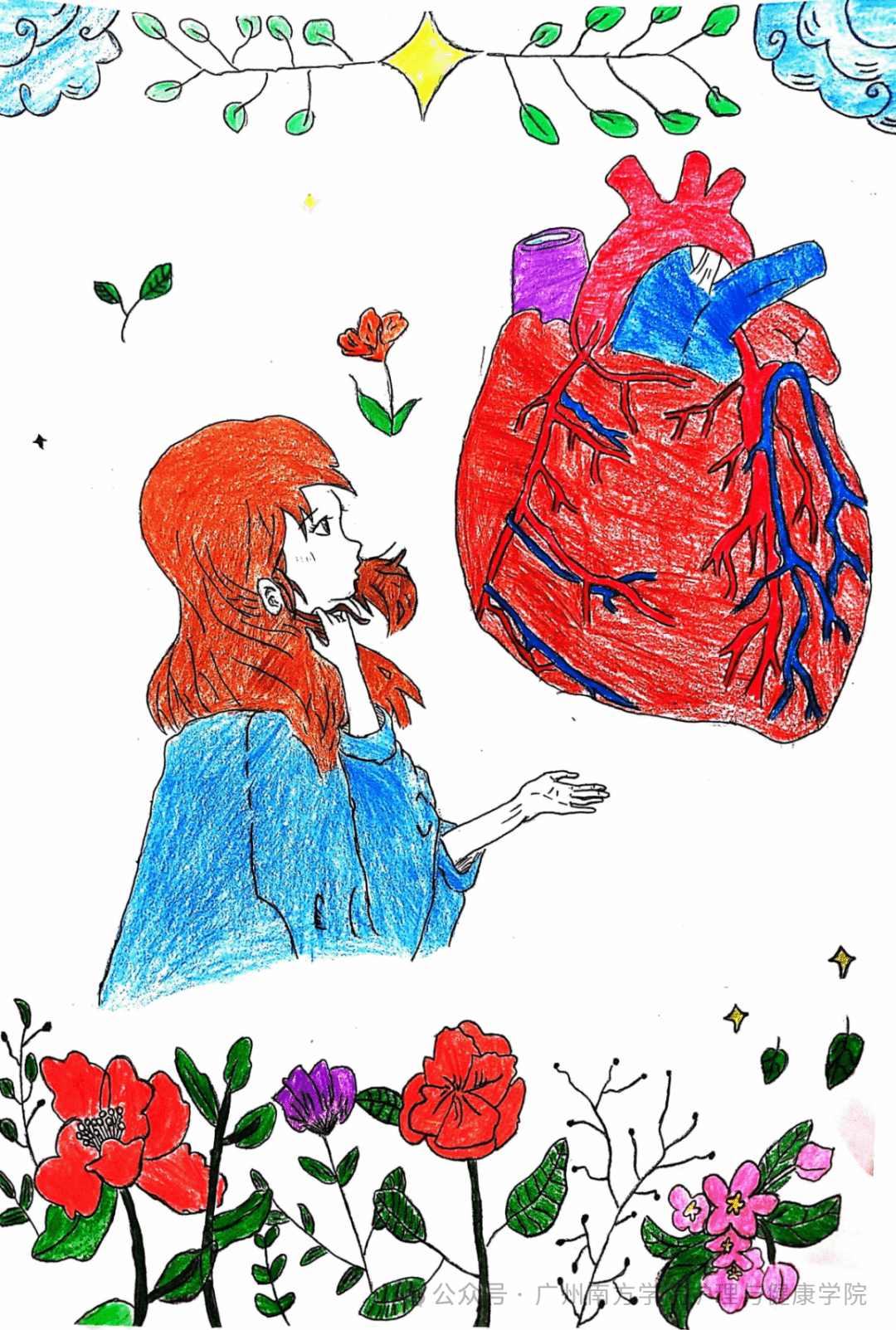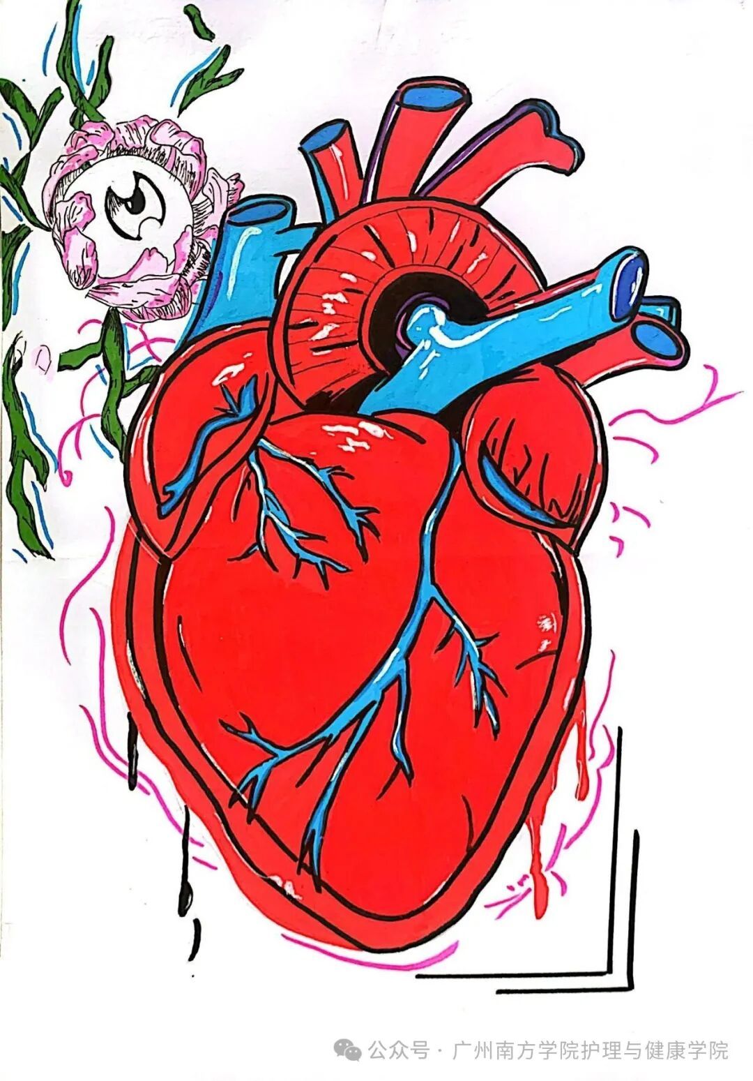 作品介绍:本作品以心脏为核心元素,聚焦当代人因生活压力大、熬夜成习而频发的心脏健康问题,旨在呼吁大众重视心脏健康。画面中,一只手稳稳托住心脏,象征人们对心脏健康的主动呵护,强调个体在维护心脏健康过程中的责任与力量。画面点缀绿植与花朵:绿植寓意健康生活方式,如适度运动、亲近自然,这些积极习惯恰似养分滋养心脏;花朵则象征美好与希望,传递出心脏健康带来的愉悦与活力。呼吁人们重视心脏健以积极的生活态度和行动,守护这台维系生命的“发动机”。
