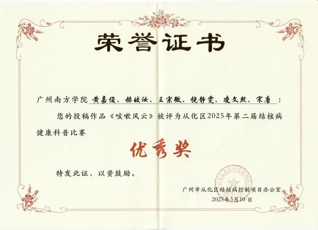 由广州市从化区结核病控制项目办公室主办,以“终结结核流行、守护健康呼吸”为主题的第二届结核病健康科普比赛,吸引了全区高校、医院及基层医疗机构的积极参与。在本次比赛中,我院学子凭借扎实的专业知识和创新的科普形式,荣获1项三等奖、3项优秀奖!此次佳绩充分展现了我院在健康科普教育领域的实力与影响力,彰显了护理与健康学院学子的社会责任感和专业素养!