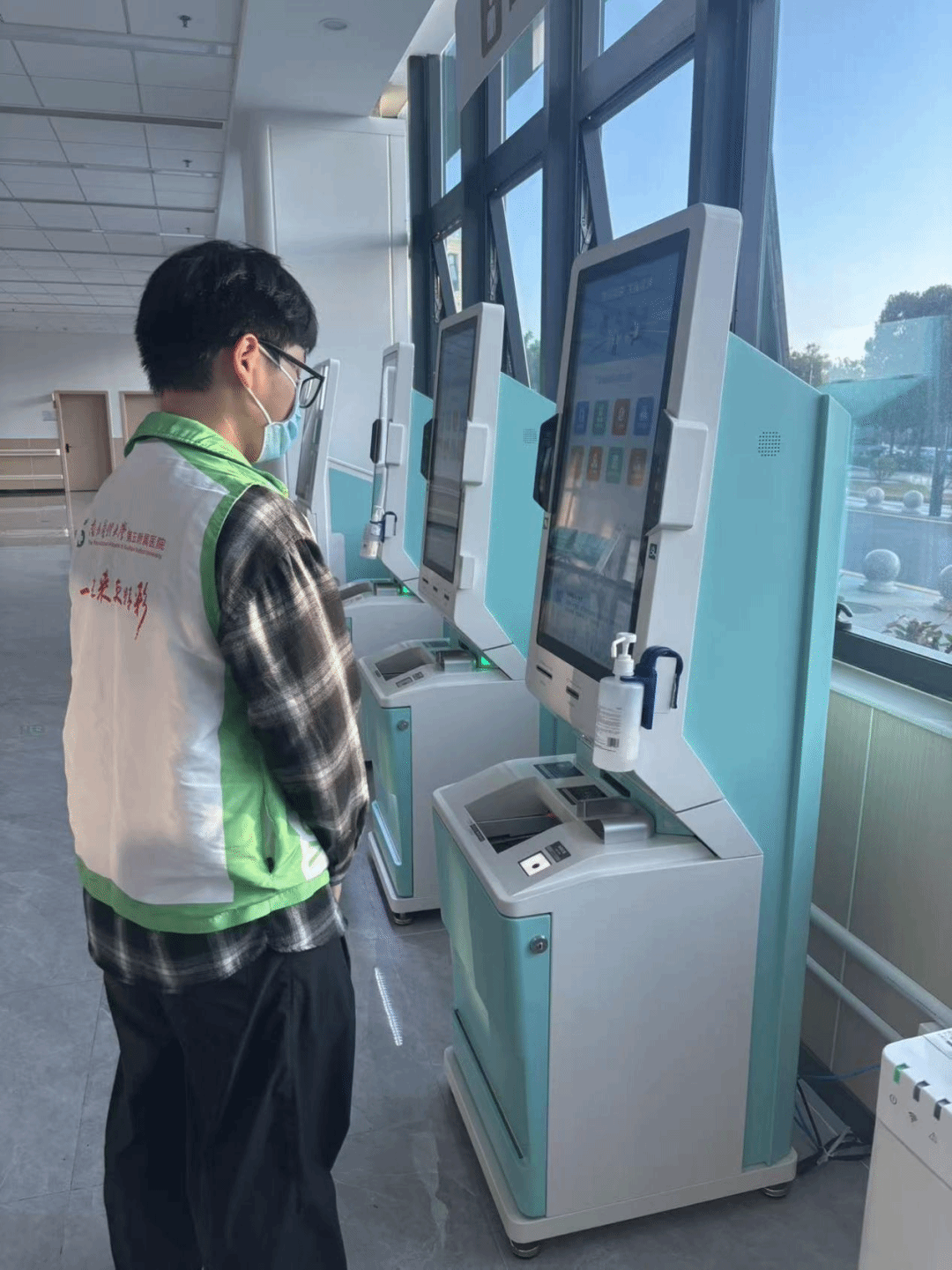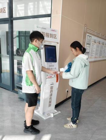 一天下午的南方医科大学第五附属医院药房报到区,人来人往。我的志愿服务就从这里开始——站在两台台报到机旁,帮助患者完成取药前的第一步。