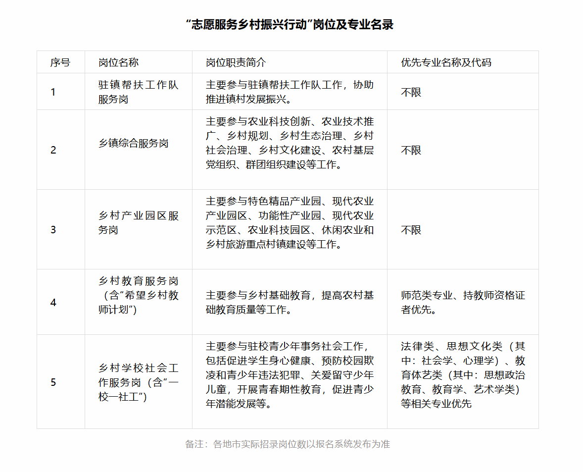 1.拥护中国共产党领导,热爱祖国、热爱人民、热爱社会主义,理想信念坚定、思想政治素质好;2.具有一定的组织协调能力和团队合作能力,具有吃苦耐劳、无私奉献的精神;3.有志于扎根基层、服务乡村振兴,自愿到农村基层工作;4.身心健康,符合项目体检及心理素质要求,具备能胜任基层工作的基本素质和能力;5.应届毕业生志愿者在到岗之前须获得毕业证书;6.中共党员或共青团员优先;7.特定岗位应具备相应的专业背景和相关经历。