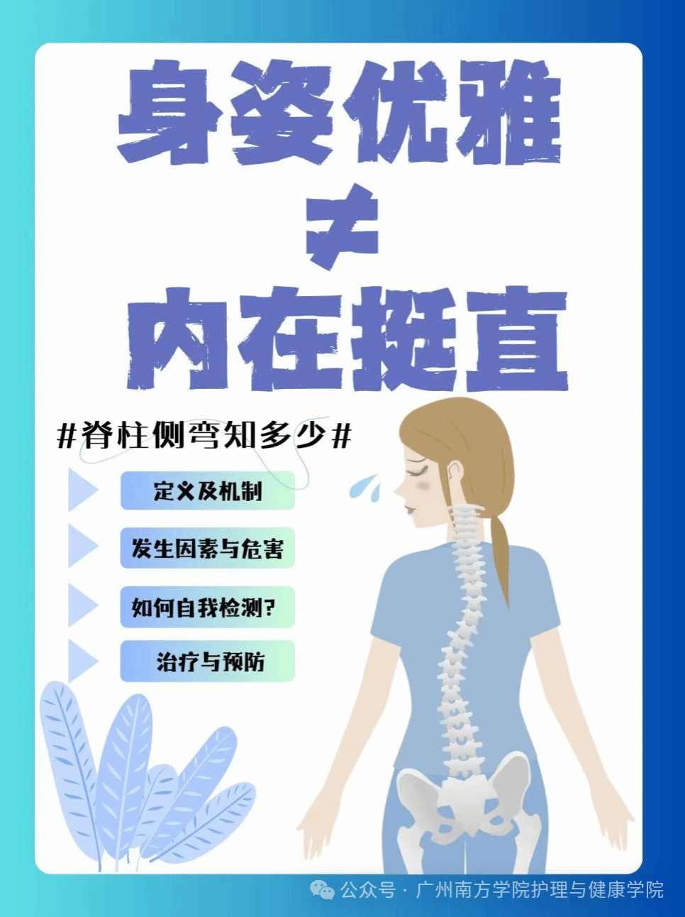 作品介绍:脊柱侧弯是一种常见但容易被忽视的脊柱畸形,影响青少年及成人。本视频从成因、常见类型和防治措施三方面来全面剖析脊柱侧弯,内容涵盖遗传、姿势、营养、神经肌肉功能及环境因素的影响,强调正确坐姿、站姿和锻炼的重要性,旨在为青少年、家长及关注健康的人士提供脊柱健康的守护指南。