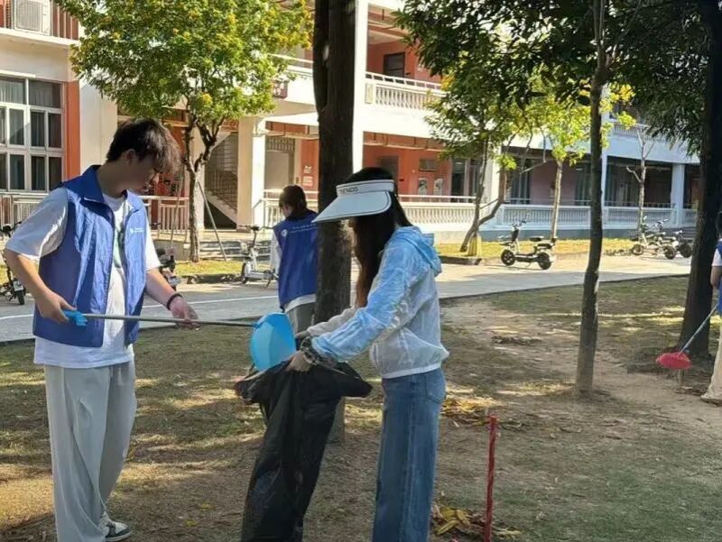 在活动现场,师生分工明确、协作有序。学生志愿者们手持清洁工具,认真清理地面纸屑与落叶,并对台阶接缝、绿化带周边等重点区域进行深度清理。辅导员则逐处排查易被忽略的区域,指导并检查清洁成效。整个流程涵盖清扫、分类、清运等环节,规范有序、衔接顺畅。师生们始终以高度的责任心投入工作,行动高效,责任区环境焕然一新。