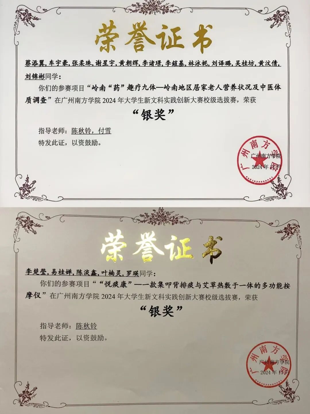 近日,2024年大学生新文科实践创新大赛校级选拔赛圆满落幕。本次大赛设置文史哲、经管法、教育、艺术四个组别,我院共派出两支参赛队伍,在陈秋铃老师和付雪老师的悉心指导下,我院学子充分发挥学科专业优势,聚焦康复护理和中医药膳提出应用型实践创新项目,最终取得两项银奖的好成绩!