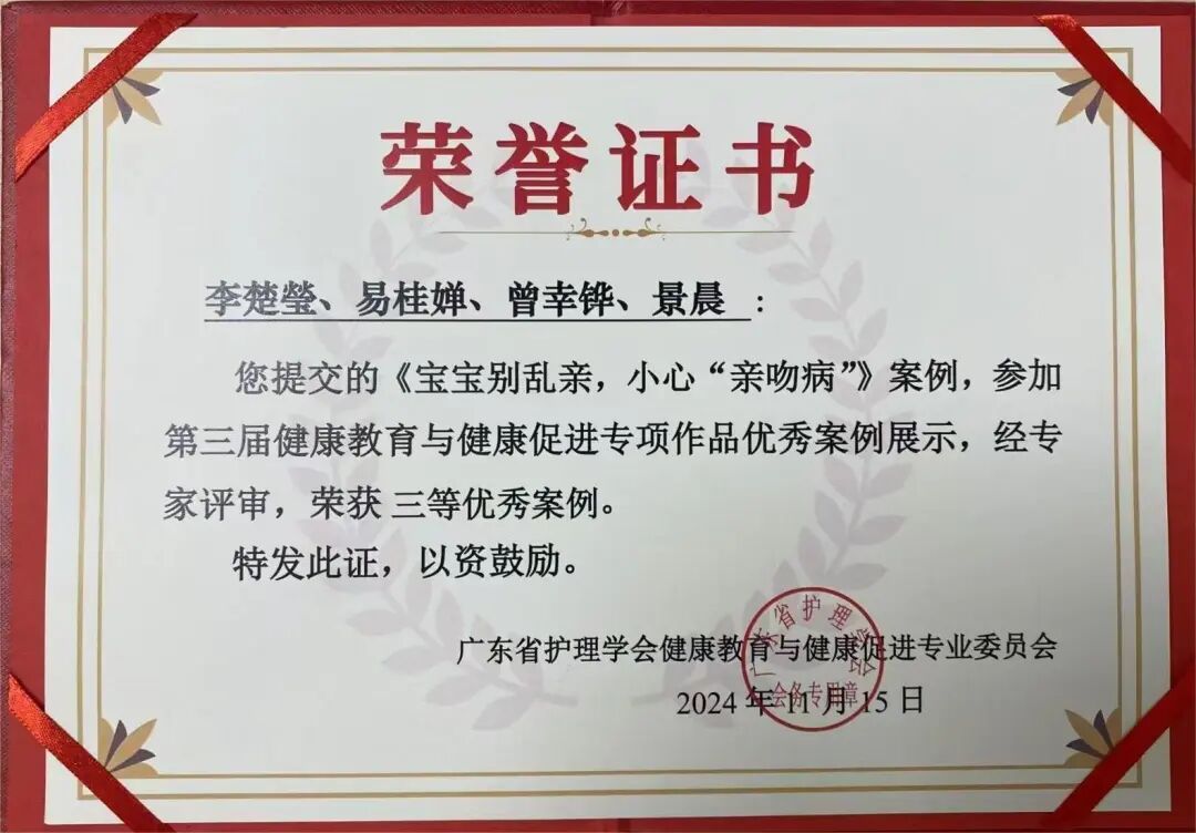2024年11月15日至11月17日,广东省护理学会健康教育与健康促进专业委员举办健康教育理论与健康促进技术创新培训班暨第三届健康教育与健康促进专项作品优秀案例作品展示,在我院景晨老师的悉心指导下,我院2022级护理学专业李楚瑩、曾幸铧、易桂婵创作的作品《宝宝别乱亲,小心“亲吻病”》荣获优秀案例三等奖。