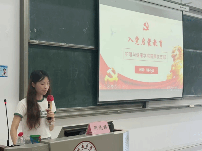 何送妹老师围绕中国共产党的基本情况、性质与宗旨进行阐述,并着重讲解了入党流程及相关手续,有效增进同学们对党的理解与认同。她介绍护理与健康学院直属党支部的基本情况,鼓励同学们加入学生党支部并积极参与党支部活动。她殷切期望同学们能够坚守初心、志存高远、脚踏实地、锐意进取,将青春的奋斗融入党和人民的伟大事业之中。