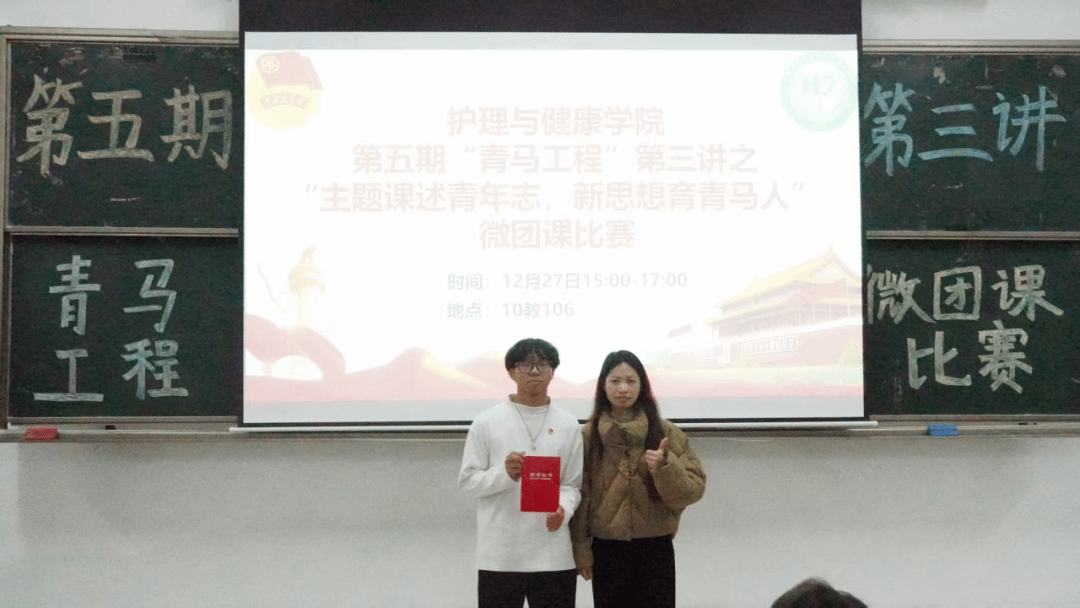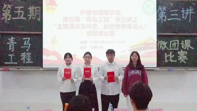为帮助同学们将理论学习转化为思想认同,筑牢理想信念根基,将所学所悟转化为建功新时代的实际行动,为国家发展注入青年智慧与活力,12月27日下午,广州南方学院护理与健康学院团委于10教106室开展第五期“青马工程”第三讲。本次活动以“主题课述青年志,新思想育青马人”为主题,举行微团课比赛。我院党总支副书记兼学工办主任何送妹老师,辅导员戚晓韵、李金豪老师,团委学生副书记陈泳诗、潘恒翰同学、第五期“青马工程”培训班学员及各级学生代表参加本次活动。