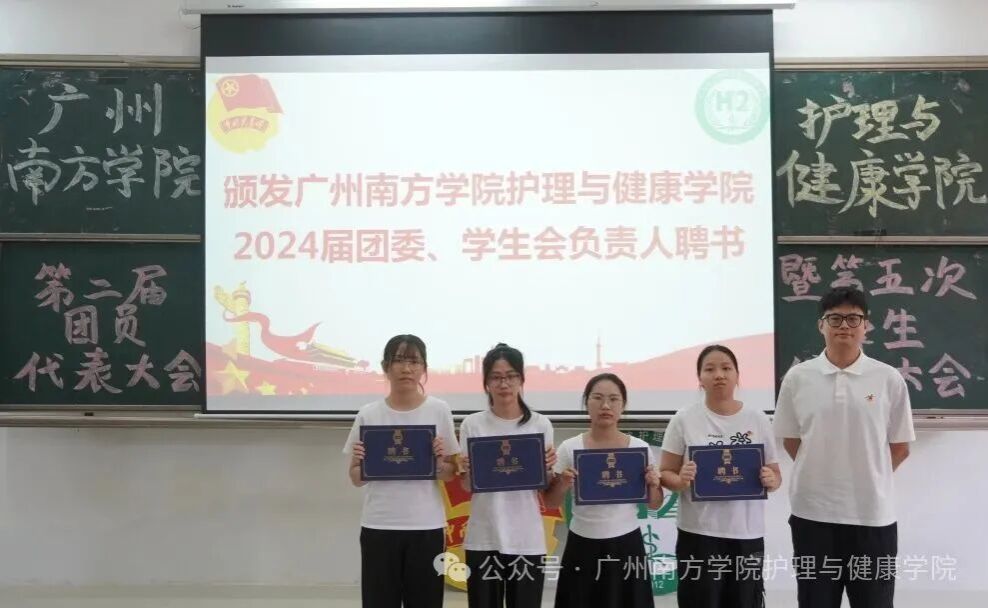 宋唐老师为广州南方学院护理与健康学院第四届学生会各职能部门负责人颁发聘书。