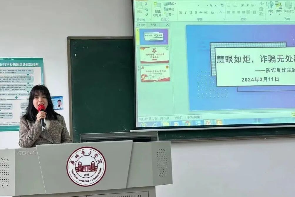 2023级辅导员陈乐瑶老师向同学们讲解了有关如何拦截境外电话、“三不三拒绝”防诈口诀、五大反诈利器和“断卡”行动等知识。