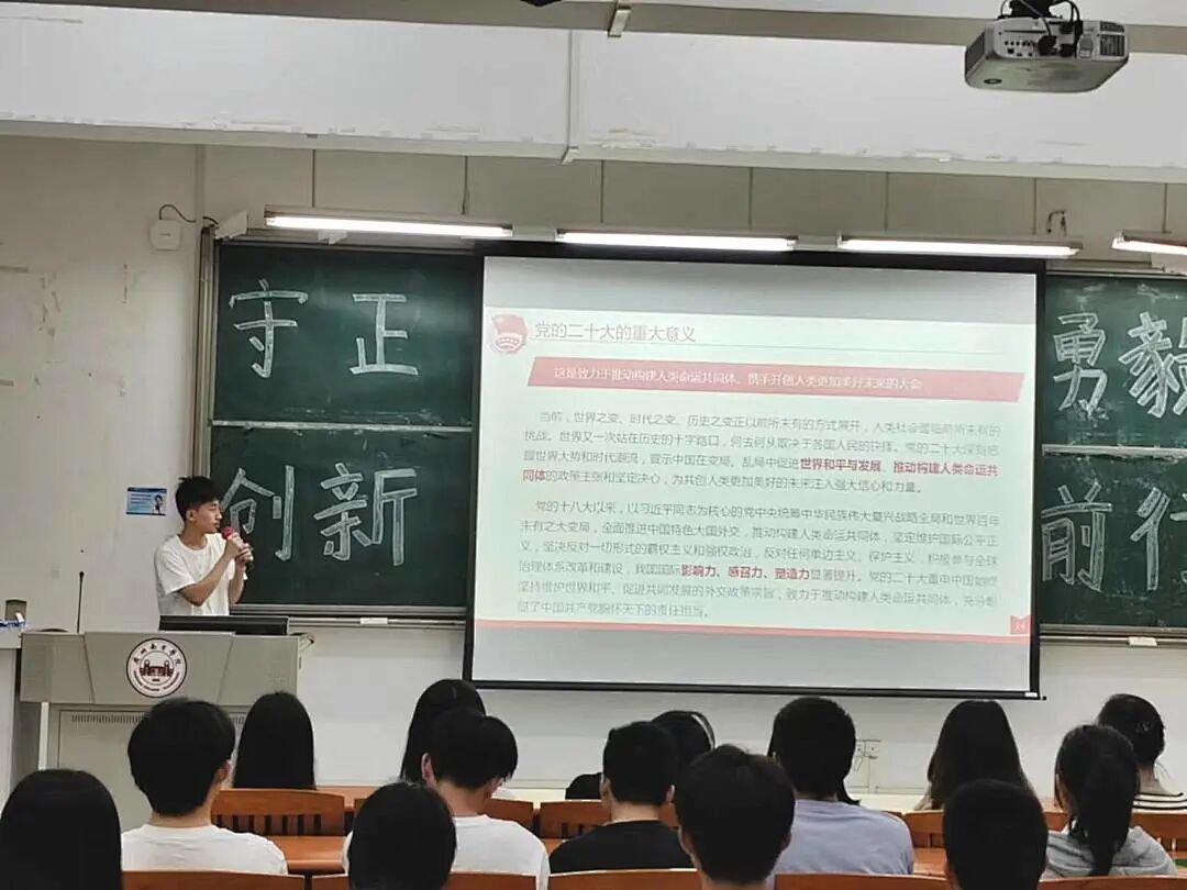 预展示环节结束后,团委老师和团支部小组一致推荐张伟东同学作为代表,进行最后的课程展示和总结汇报。张伟东同学就“党的二十大的重大意义”着重展开讲述,他说到,党的二十大是新时代新征程中具有里程碑意义的重要会议。他以“学习和贯彻党的二十大精神”为出发点,启发同学们要知行合一,牢牢掌握党的二十大精神要领。他还强调应着重培养新时代青年的优秀精神品质,继承革命前辈们敢担当、能吃苦的优良作风,为新时代新征程汇智聚力。