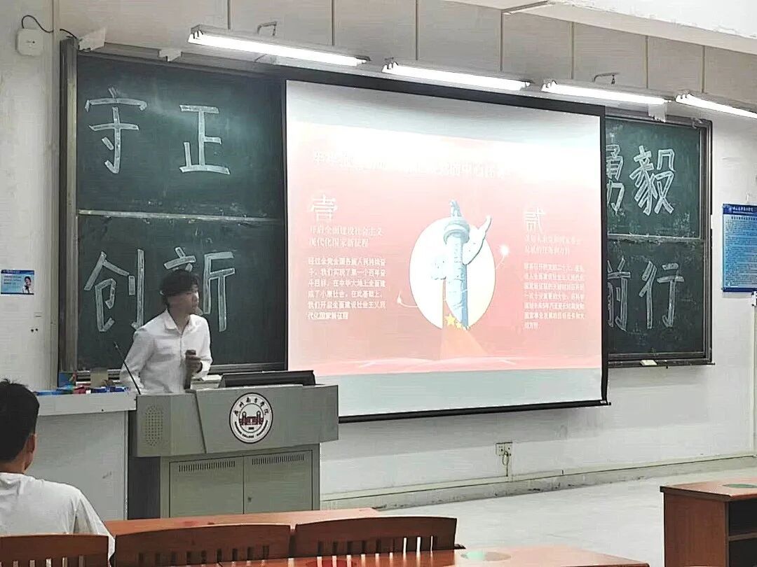 第二团支部小组围绕“高举中国特色社会主义伟大旗帜”、“牢牢把握新时代新征程的发展要求”、“坚持全心全意为人民服务”三大方面进行讲述,向新时代青年指明了未来奋斗的方向,引导青年学生树立远大理想,鼓励同学们成为自己人生的掌舵手,勇立新时代潮头、奋楫争先。