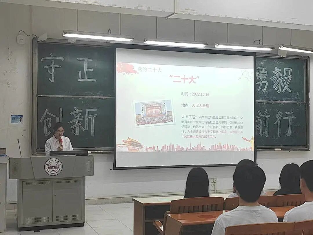 第三团支部小组详细介绍了党的二十大内容,将新青年与新时代紧密联系在一起,他们表示:我们青年是新时代的主要力量,是新征程的推进动力,广大青年学生们应矢志不渝、砥砺前行,在青春的生动实践中开创属于中国青年未来的崭新赛道,在新时代新征程的建设中书写人生华章。
