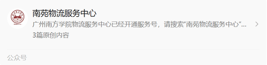 广州南方学院物流服务中心已经开通服务号,请搜索“南苑物流服务中心”就可以关注哦!新的服务号将提供更多服务哦!